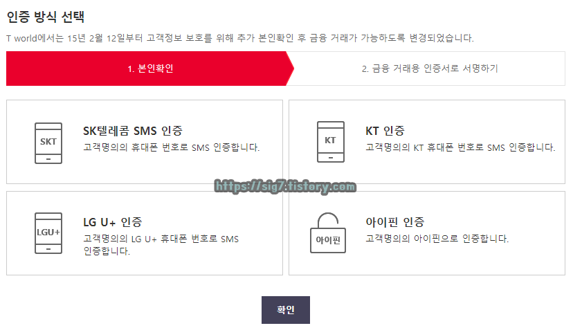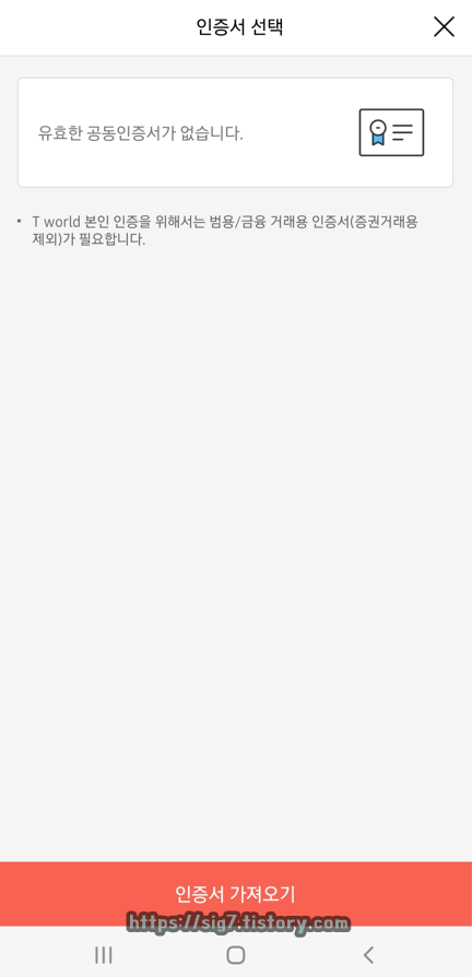 공동인증서는 PC(티월드 홈페이지)를 통해 직접 가져와야 합니다. 현재 사용 중인 모바일 기기 내부 저장소에 공동인증서가 있다고 하더라도 말이죠.
