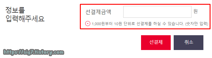 선결제 금액을 1,000원부터 10원 단위까지 입력해줍니다. 그리고 이어서 '결제 정보'를 입력해줍니다.