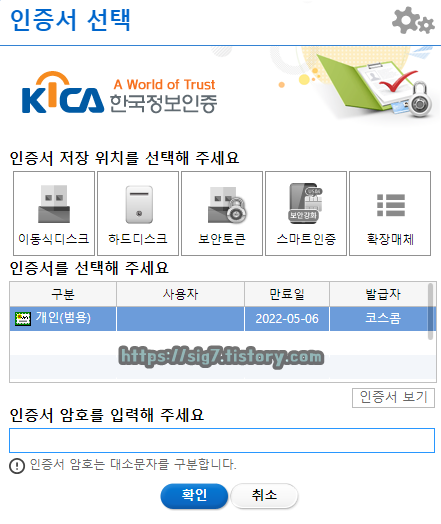 공동인증서를 선택한 후, 암호를 입력해줍니다.