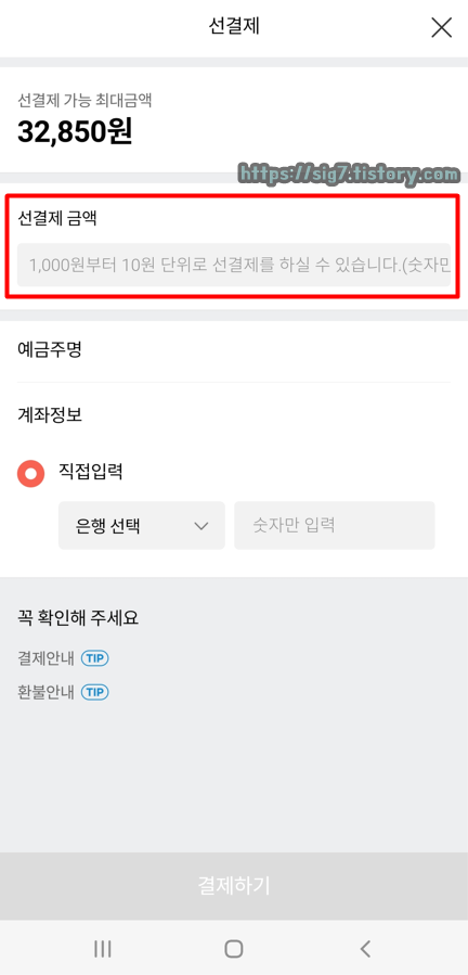 선결제 금액을 1,000원부터 10원 단위로 입력해줍니다. 입력했다면, 아래에 보이는 '선결제'를 눌러줍니다.