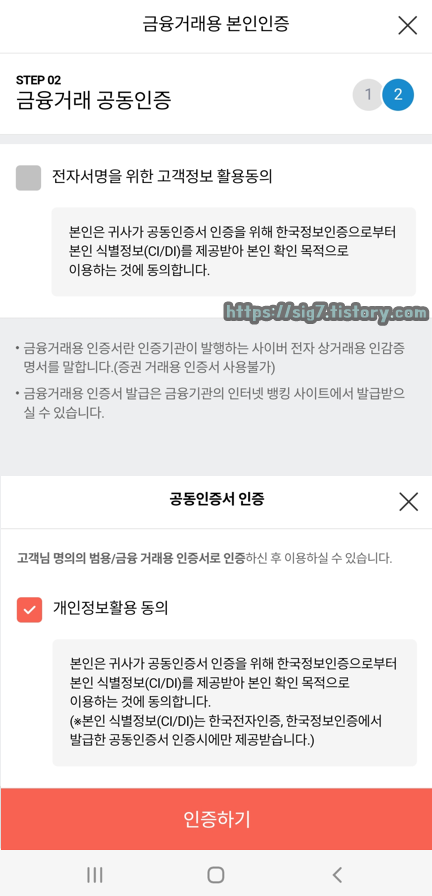 이어서 '공동인증서 인증'을 해줄 차례입니다. 고객 정보 활용 동의에 체크한 후, 아래에 보이는 '금융 인증 하기'를 눌러줍니다.