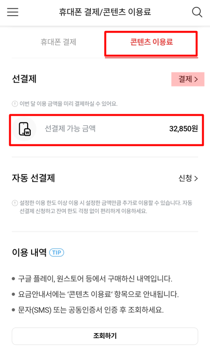 휴대폰 결제 또는 콘텐츠 이용료 이용 금액을 확인해줍니다.