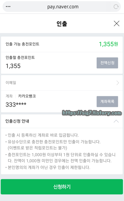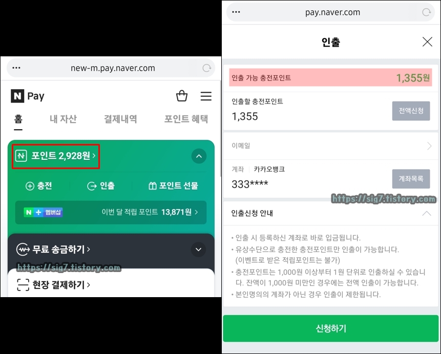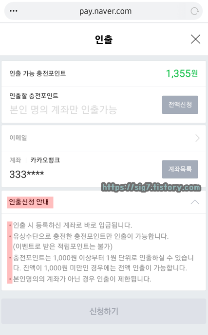 인출 가능 포인트를 입력한 후, 아래에 보이는 '신청하기'를 눌러줍니다. 이어서 '간편 결제 비밀번호'를 입력해줍니다.