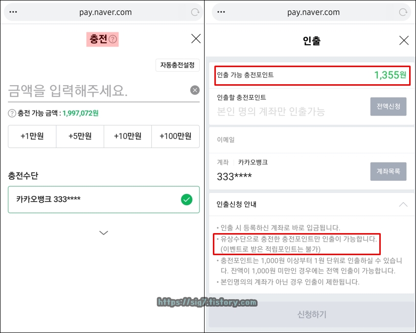 네이버페이 출금 가능 포인트는 '유상 수단으로 충전한 충전 포인트'입니다. 여기서 말하는 유상 수단은 '실시간 계좌이체'를 뜻합니다. 즉, 현금을 주고 충전한 포인트만 출금이 가능하다는 것이죠.