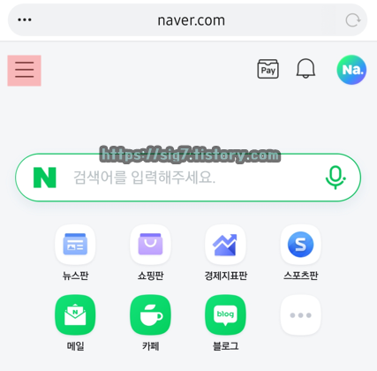 먼저 '네이버 홈페이지'에 접속해줍니다. 이어서 좌측 상단에 보이는 전체 메뉴(선이 3개 그어진 것)를 눌러줍니다.