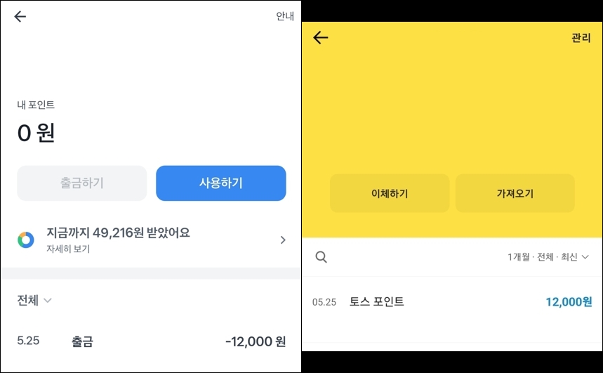 계좌 입금 내역을 확인해보니 '토스 포인트'라는 이름으로 12,000원이 입금되었다는 것을 확인할 수 있었습니다.