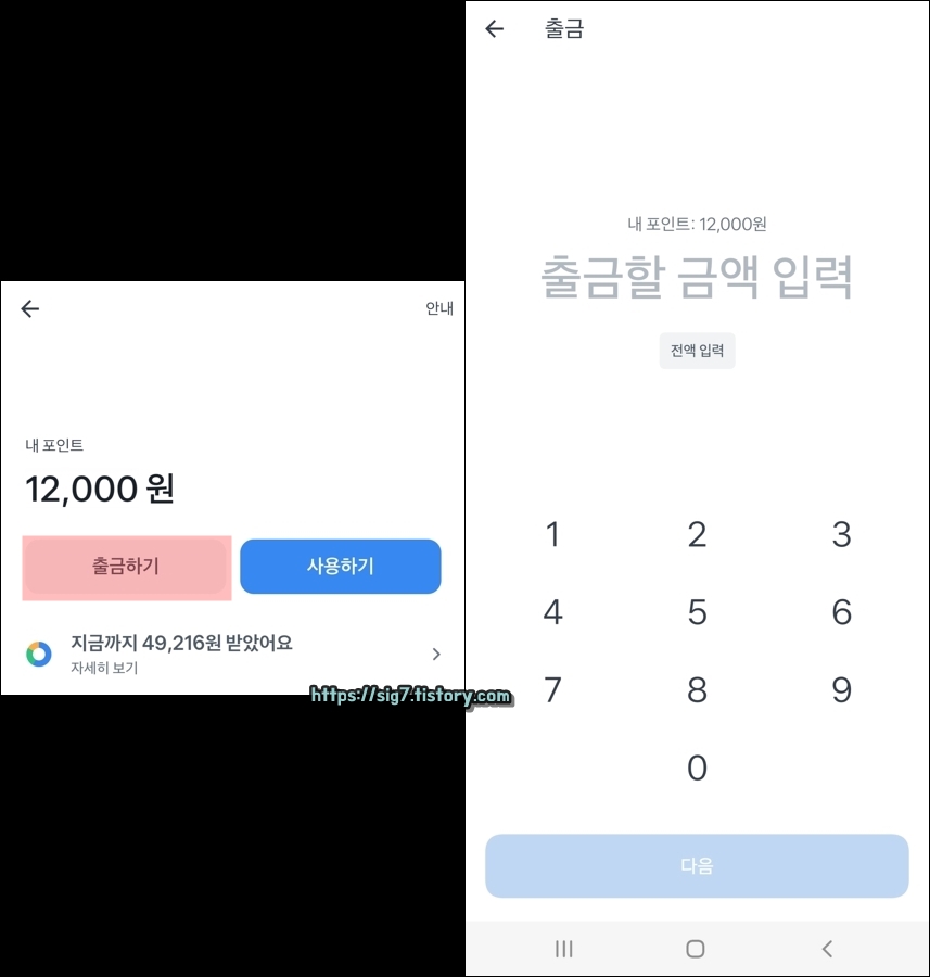 아래에 보이는 '출금하기'를 누른 후, 결제 비밀번호 또는 생체 인증(지문 인식)을 해줍니다.