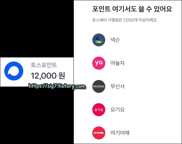 참고로 토스 포인트 사용이 가능한 가맹점은 넥슨, 야놀자, 무신사, 요기요, 여기어때 등 7,000개 이상입니다.