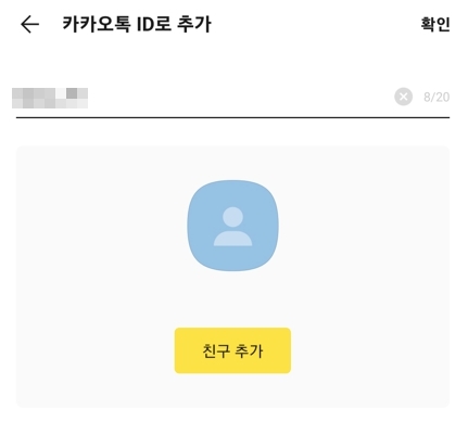 카카오톡 ID로 친구를 검색한 모습입니다. 아래에 보이는 친구 추가 버튼을 누르면 카카오톡 친구 목록에 추가시켜줄 수 있습니다.