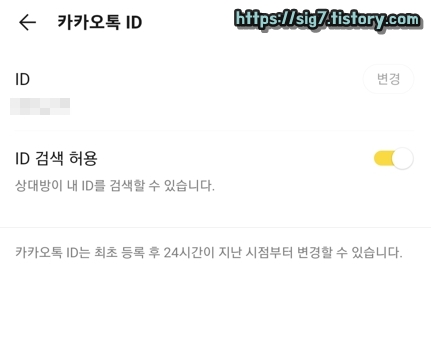 ※ 만약 나의 카카오톡 ID가 검색되지 않게 하고 싶다면, ID 검색 허용 기능을 OFF 해주면 됩니다.