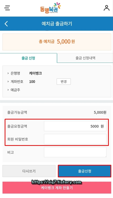 출금 은행을 케이뱅크로 변경하니 이체 수수료가 들지 않아 보유 예치금 그대로 모두 출금할 수 있게 되었네요. 출금 요청 금액과 회원 비밀번호를 입력한 후, 아래에 보이는 '출금신청'을 눌러줍니다.