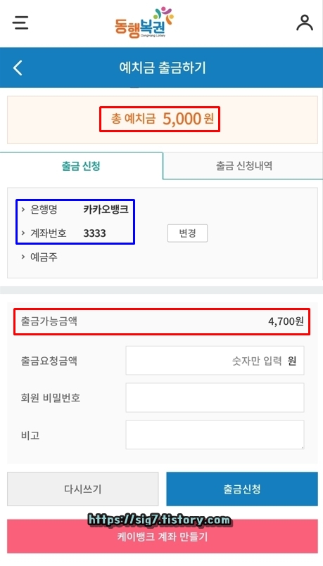 출금 신청 계좌와 출금 가능 금액을 확인해줍니다. 저 같은 경우에는 출금 신청 은행이 카카오뱅크라 이체 수수료 300원이 부과되네요. (케이뱅크는 이체 수수료 무료)