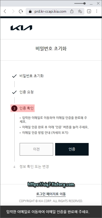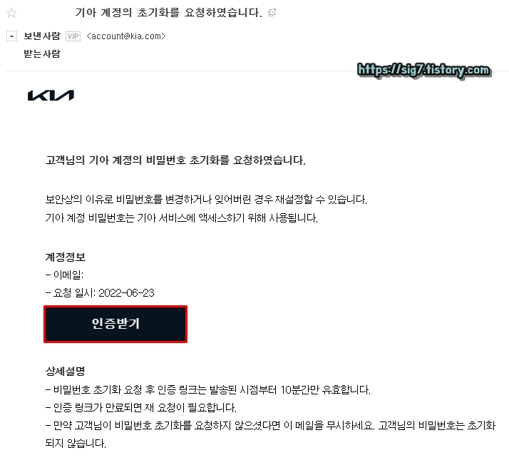 메일함으로 가 "기아 계정의 초기화를 요청하였습니다."라는 제목의 메일을 확인한 후, 메일 내용에 보이는 '인증받기'를 눌러줍니다.