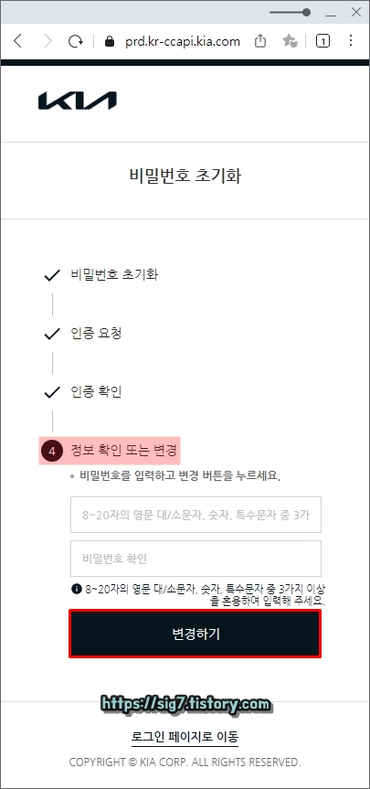 비밀번호 설정까지 끝내주면 이렇게 기아멤버스 비밀번호 초기화 및 변경이 완료됩니다.