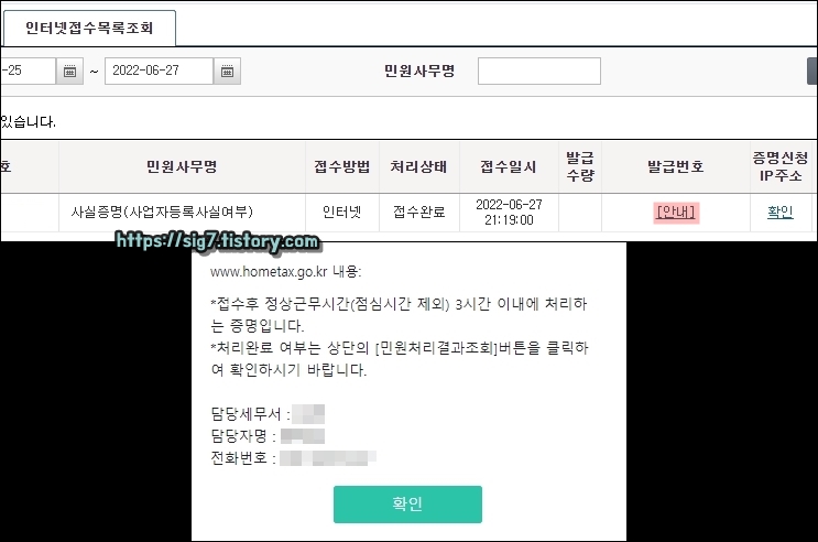 만약 증명서 민원 처리 관련해서 궁금한 점이 있다면 '인터넷접수목록조회' 발급번호 아래에 보이는 '[안내]'를 눌러 담당 세무서, 담당자명, 전화번호를 확인해 직접 연락해보면 됩니다.