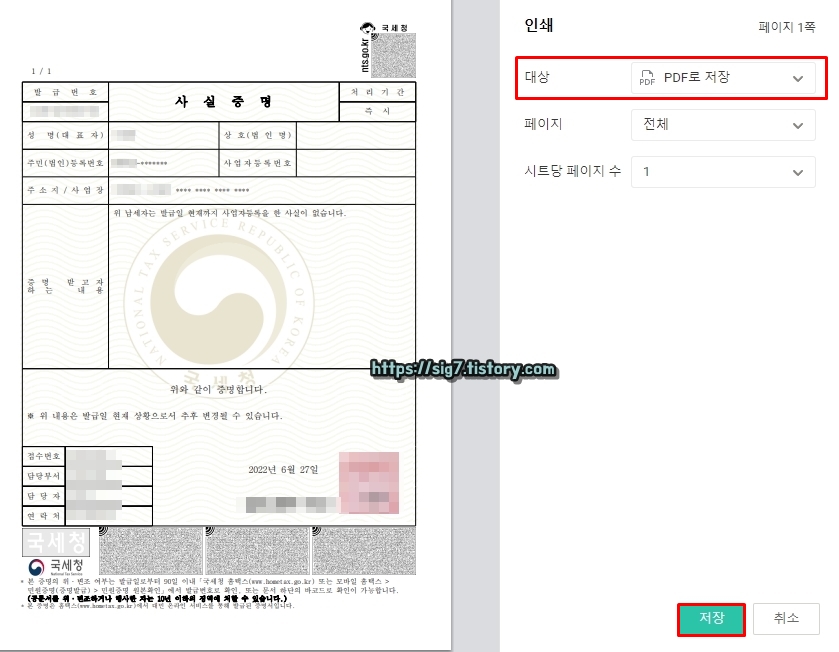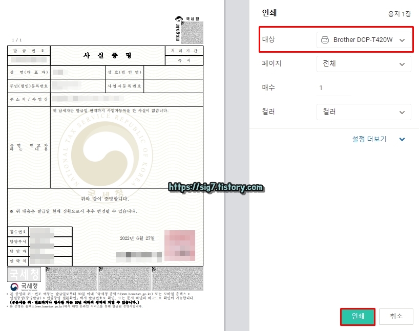 인쇄 대상(프린터기)을 선택한 후, 아래에 보이는 '인쇄'를 눌러 증명서를 출력해주면 끝입니다.