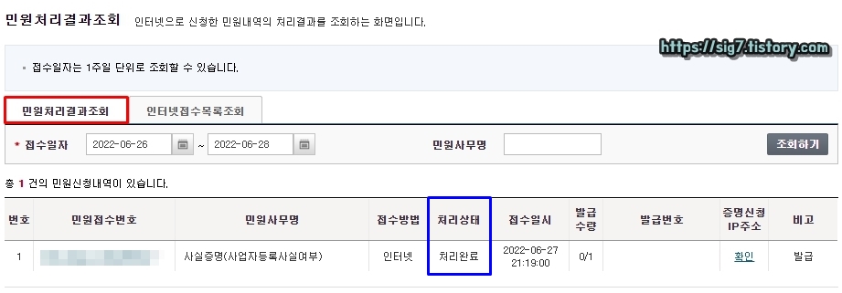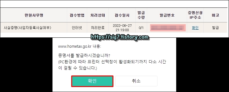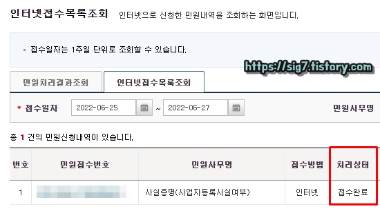 그러면 증명서 민원 신청이 완료됩니다. 사업자등록사실여부 증명서는 발급 신청 즉시 바로 민원이 처리되는 것이 아니기 때문에 민원 처리 완료까지는 세무서 영업시간 기준 약 3시간 정도 걸릴 수 있습니다.