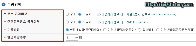 그러면 이렇게 증명서 신청 화면으로 이동되는데요. 일단 수령방법(주소 공개 여부, 주민등록번호 공개 여부 등)에 대한 정보를 입력해줍니다.