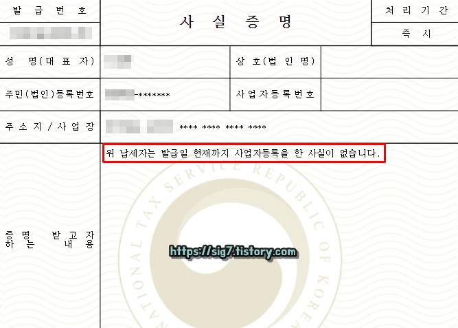 발급 신청 시 입력한 연도 범위에 사업자 등록 사실이 없다면, 위와 같이 증명서 "증명받고자 하는 내용"에 "위 납세자는 발급일 현재까지 사업자등록을 한 사실이 없습니다."라고 표시됩니다.