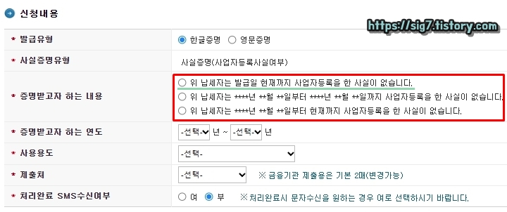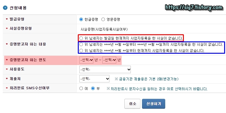 '증명받고자 하는 내용'을 선택한 후, '증명받고자 하는 연도'를 입력해줍니다. 증명받고자 하는 내용은 무난하게 '위 납세자는 발급일 현재까지 사업자등록을 한 사실이 없습니다.'를 선택해주면 됩니다.