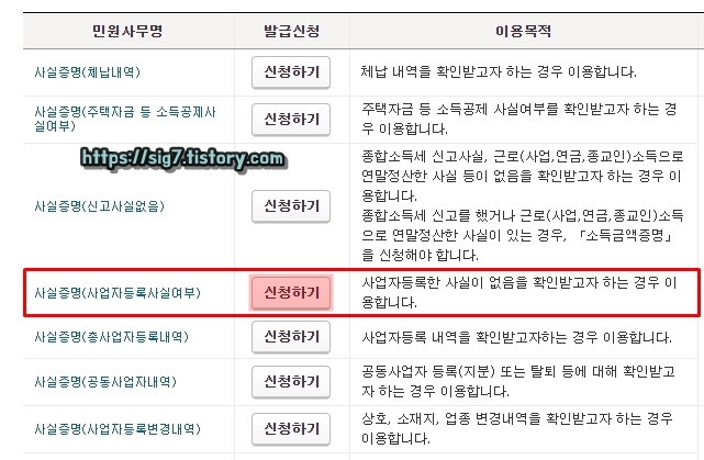 사실증명(사업자등록사실여부) 우측에 보이는 '신청하기'를 눌러줍니다.