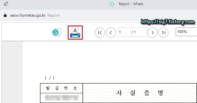 증명서 내용에 문제가 없다면, 상단에 보이는 '인쇄 버튼'을 눌러줍니다.