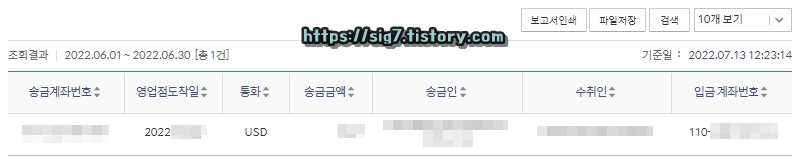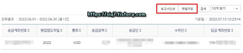 그러면 이렇게 외화송금내역이 조회될 것인데요. 이 내역을 보고서 형태로 인쇄하고 싶다면 '보고서인쇄'를 누르고, 이 내역을 엑셀이나 텍스트 파일로 저장하고 싶다면 '파일저장'을 눌러줍니다.