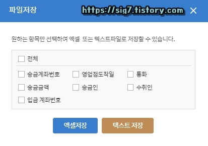 이것은 '파일저장'을 눌렀을 때 나오는 창입니다. '파일저장'은 보고서인쇄와는 다르게 원하는 항목만 선택하여 저장할 수 있다는 것이 특징입니다.