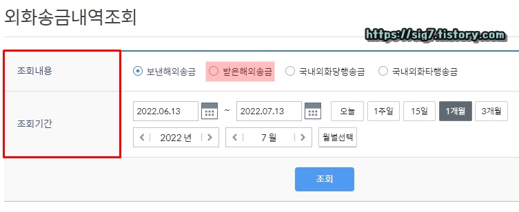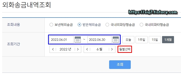 여기서 조회 내용(보낸 해외송금, 받은 해외송금 등)과 조회 기간을 선택해줍니다.
