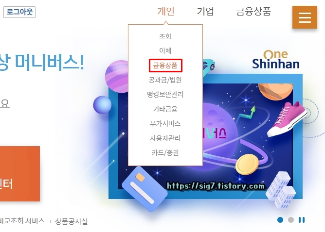 로그인 후, 메인 화면에서 개인 메뉴에 있는 '금융상품'을 눌러줍니다.