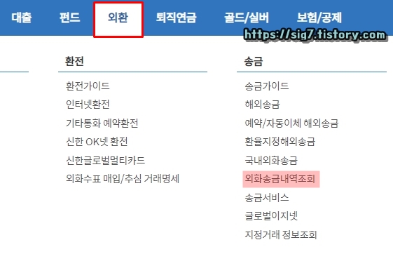 이어서 외환 메뉴에 있는 '외화송금내역조회'를 눌러줍니다.