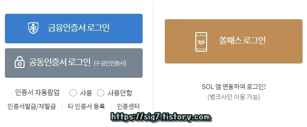 로그인 가능 수단은 금융인증서, 공동인증서(구 공인인증서), 쏠패스입니다.