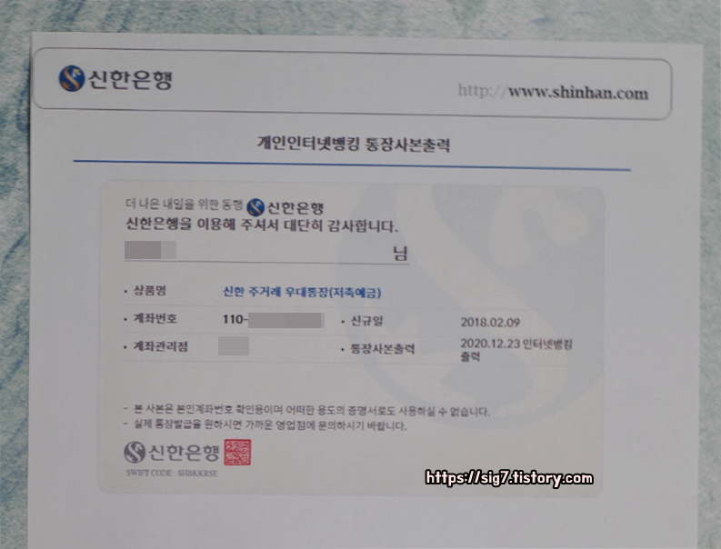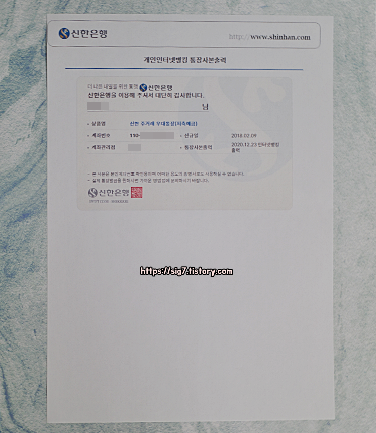 통장 사본 출력을 완료한 모습입니다. 발급부터 출력까지 5분도 채 안 걸렸네요. 신한은행 통장 사본 발급 방법 정말 간단하죠?