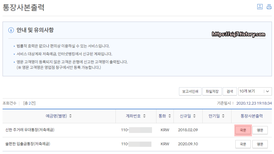 그러면 이렇게 목록에 현재 보유 중인 계좌가 나올 텐데요. 여기서 우측에 있는 국문 또는 영문을 클릭해줍니다. 참고로 국문을 클릭하면 통장 사본이 한글로 나오고, 영문을 클릭하면 통장 사본이 영어로 나옵니다.