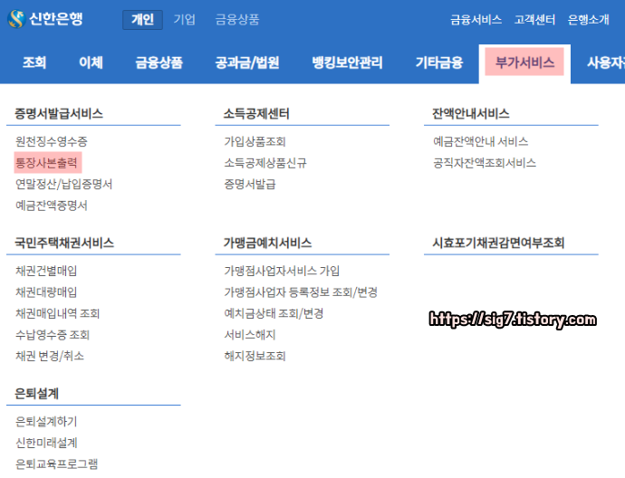뱅킹 홈페이지에서 로그인한 후, 부가서비스 메뉴에 있는 '통장사본출력'을 눌러줍니다.