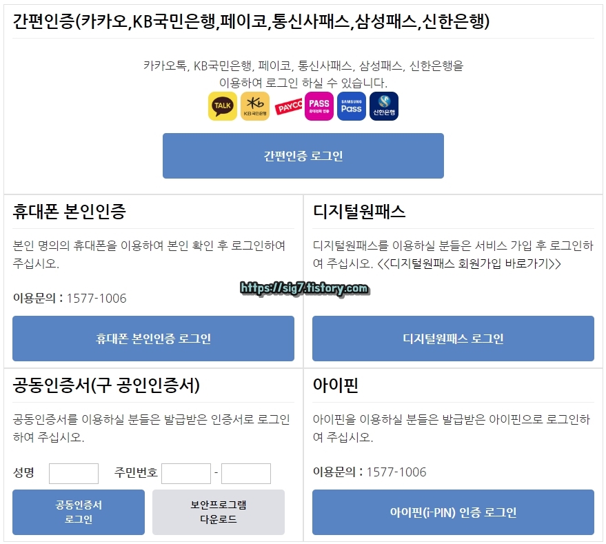 로그인 가능 수단은 간편 인증(카카오 인증서 등), 휴대폰 인증, 디지털원패스, 공동인증서(구 공인인증서), 아이핀입니다.