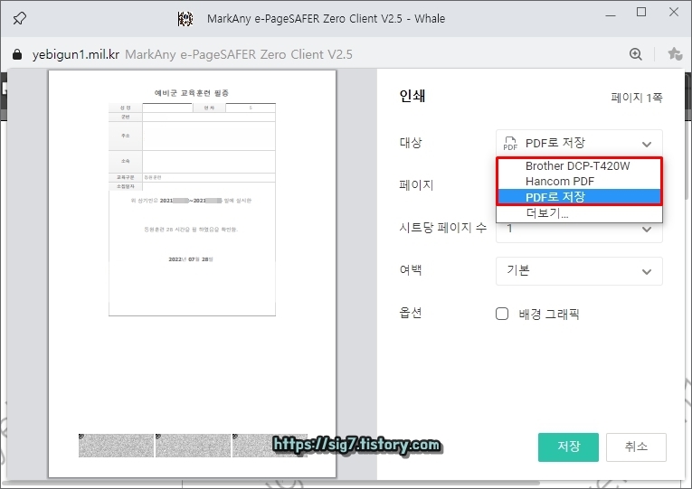 예비군 교육 필증은 프린터 인쇄 또는 PDF 파일 저장이 가능합니다. PDF 파일 저장을 원한다면, 인쇄 대상을 'PDF로 저장'으로 바꿔주세요.