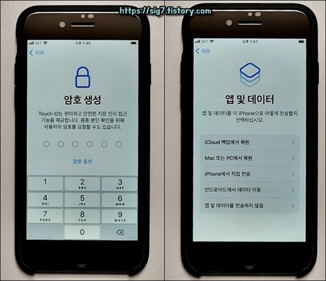 아이폰 암호 설정은 초기 설정에서 다시 새롭게 하게 되고, 복원할 데이터가 있다면 '앱 및 데이터 단계'에서 복원 또는 데이터 이동을 하면 됩니다.