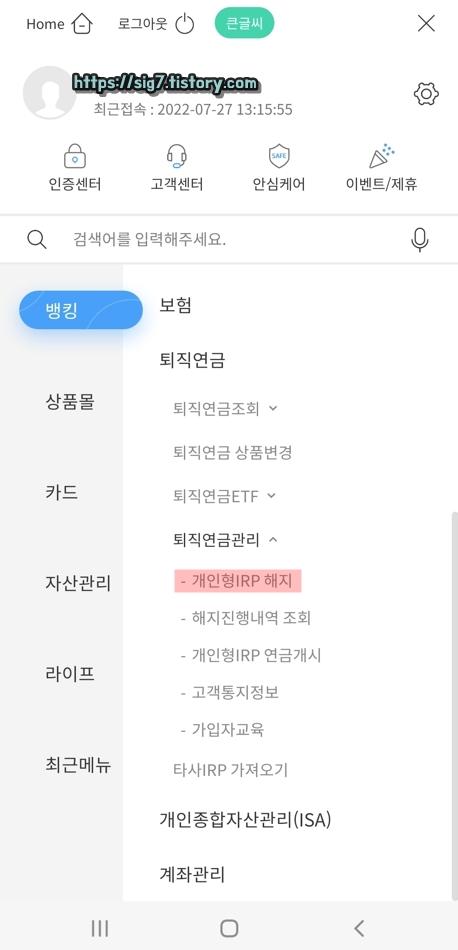 이어서 "뱅킹 메뉴 > 퇴직연금관리 메뉴"에 있는 "개인형 IRP 해지"를 눌러줍니다.