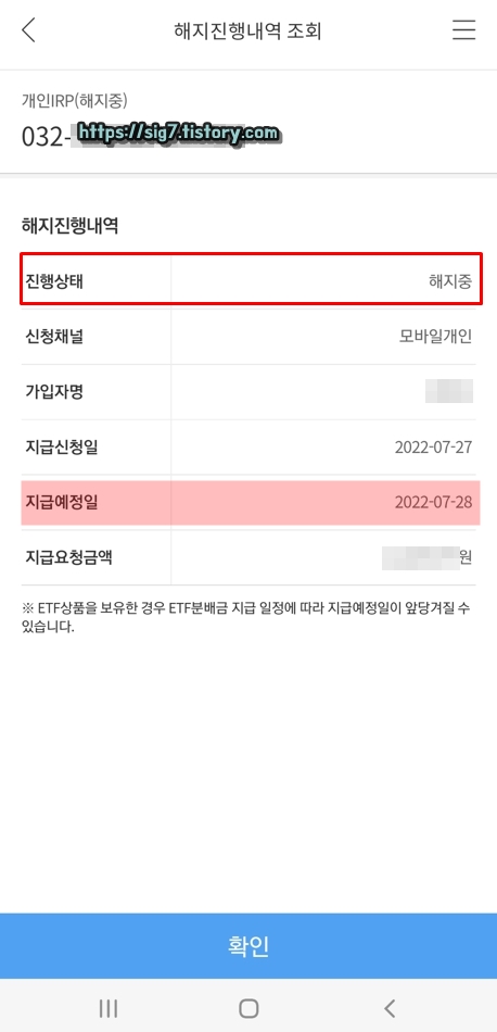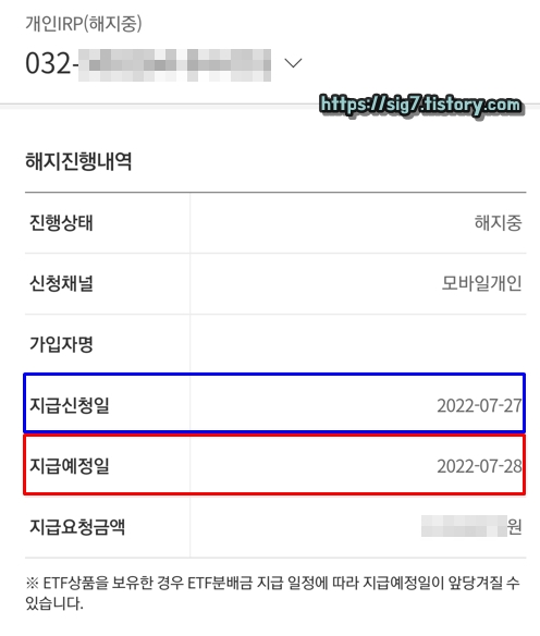 해지 신청 완료 이후, 해지 진행 내역을 조회해보면 퇴직금(퇴직 연금 해지 환급금) 지급 예정일을 확인할 수 있습니다. 저 같은 경우에는 퇴직 연금 해지 신청을 22년 07월 27일 수요일에 했었는데요. 퇴직금 지급일은 해지 바로 다음날인 22년 07월 28일 목요일이었습니다.