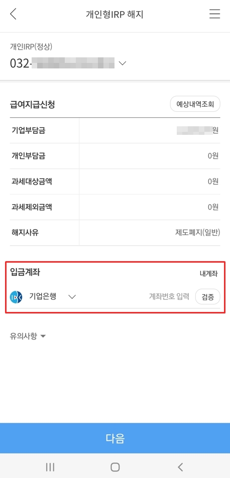 ※ 퇴직금 지급이 완료되면 기업은행 퇴직연금 개인 IRP 계좌로 돈이 들어옵니다. (이후 해지 필요)