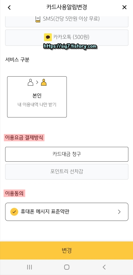 이어서 이용 요금 결제 방식(카드 대금, 포인트리 선차감)을 선택한 후, 이용 동의를 해줍니다. 모두 입력했다면 아래에 보이는 '변경'을 눌러줍니다.