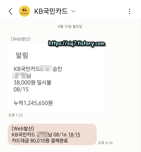 국민카드 결제 내역 문자 알림 서비스를 가입한 후, 해당 카드를 사용하면 이렇게 실시간으로 결제 정보를 문자로 받을 수 있습니다. 결제 알림 문자에는 사용카드 번호, 성명, 사용 금액, 할부 사용 여부, 결제일, 결제 시간, 누적 사용 금액까지 모두 상세히 적혀있죠.
