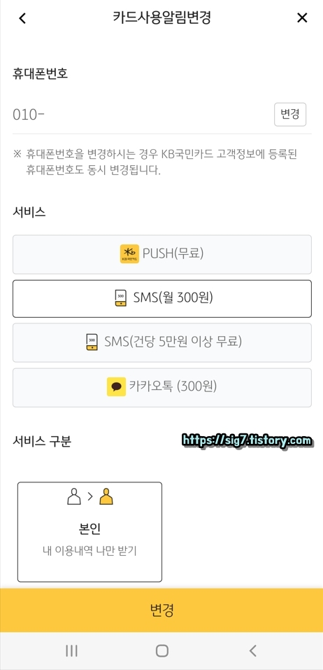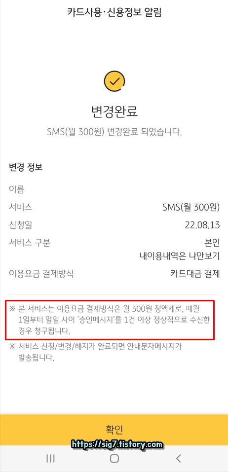 그러면 이렇게 국민카드 결제 문자 알림 서비스 신청이 완료됩니다.