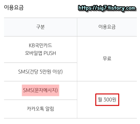 국민카드 SMS 결제 알림 서비스는 무료가 아닌 유료 서비스이며, 한 달에 300원씩 계속 내야 하는 서비스입니다.