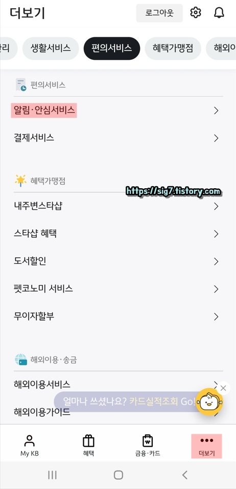 로그인 후, 더보기 탭에 보이는 '알림 및 안심서비스'를 눌러줍니다.
