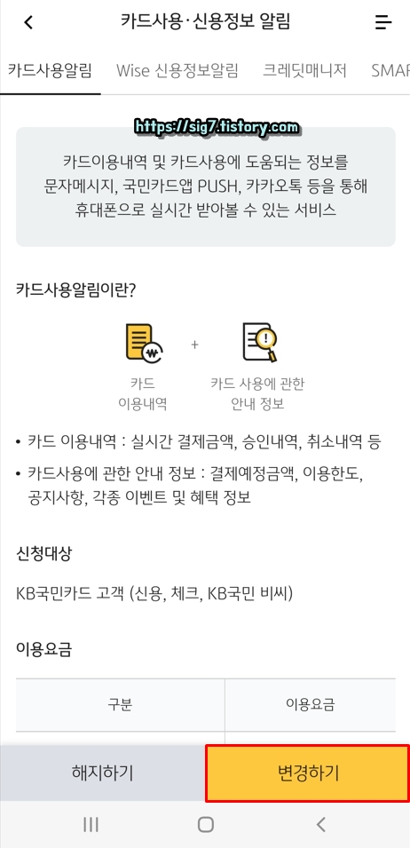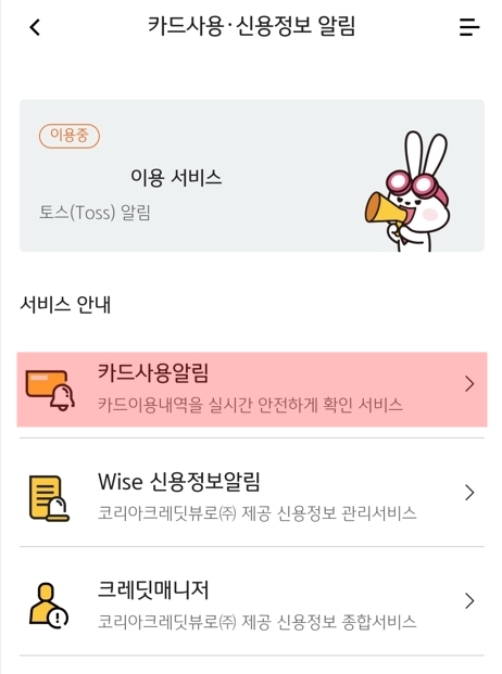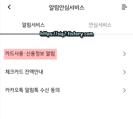 여기서 '카드사용 및 신용정보 알림'을 눌러줍니다.