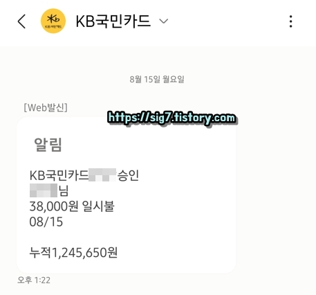 ※ KB국민카드 모바일앱 PUSH로 받으면 이용 요금이 무료입니다. (결제 알림 지연이 가끔 있음)