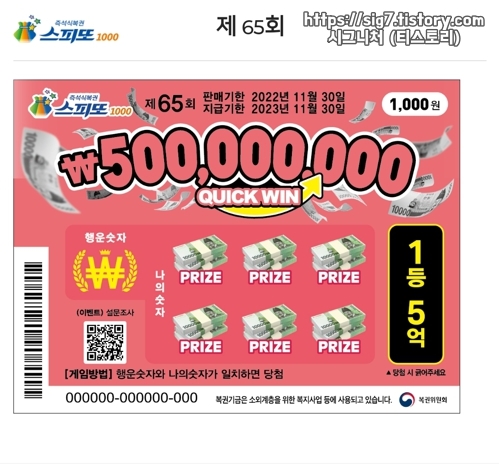 ※ 스피또1000 65회 1등 5억 당첨 확률은 500만 분의 1입니다. (총 9매)