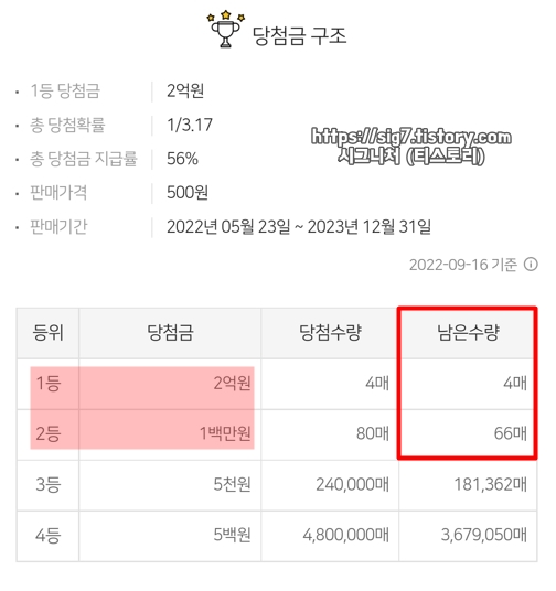 스피또500 42회차 남은 당첨 복권은 1등 2억원 4매, 2등 1백만원 66매입니다. (22년 09월 16일 금요일 업데이트 기준 정보)